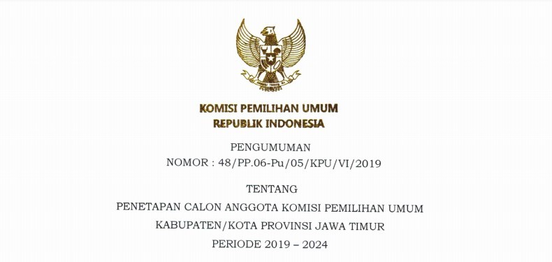 PENGUMUMAN PENETAPAN CALON ANGGOTA KPU KABUPATEN/ KOTA PROVINSI JAWA TIMUR PERIODE 2019-2024