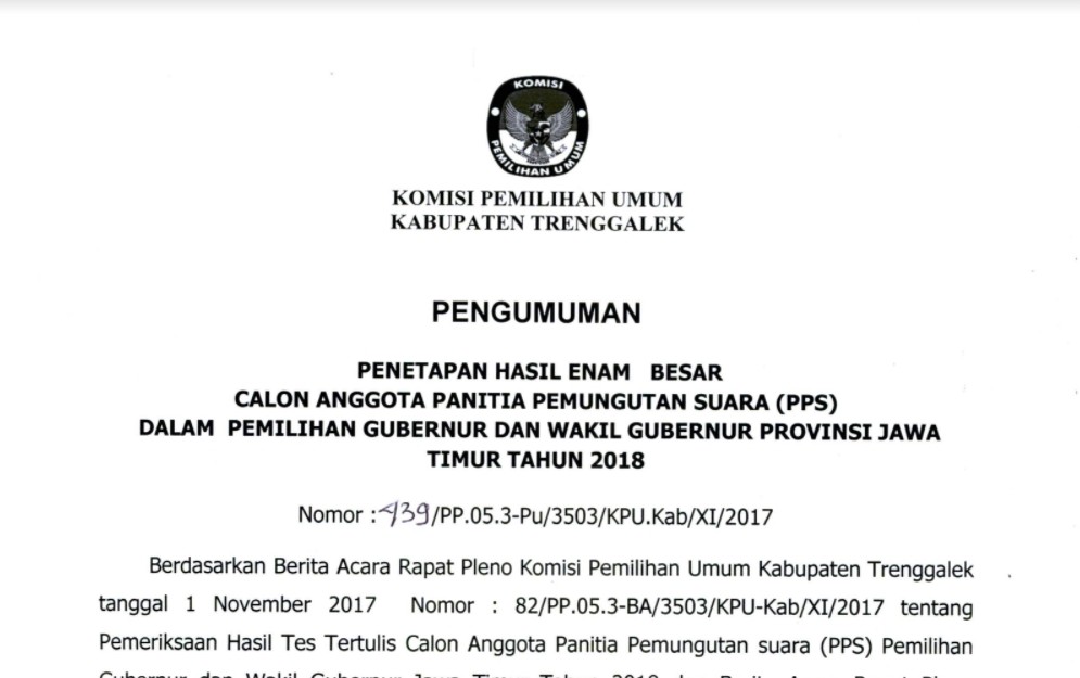 Berdasarkan Berita Acara Rapat Pleno Komisi Pemilihan Umum Kabupaten Trenggalek tanggal 1 November 2017 Nomor : 82/PP.05.3-BA/3503/KPU-Kab/XI/2017 tentang Pemeriksaan Hasil Tes Tertulis Calon Anggota Panitia Pemungutan suara (PPS) Pemilihan Gubernur dan Wakil Gubernur Jawa Timur Tahun 2018 dan Berita Acara Rapat Pleno Komisi Pemilihan Umum Kabupaten Trenggalek tanggal 1 November 2017 Nomor : 83/PP.05.3-BA/3503/KPU-Kab/XI/2017 tentang Penetapan 6 (enam) Besar Calon Anggota Panitia Pemungutan suara (PPS) Pemilihan Gubernur dan Wakil Gubernur Jawa Timur Tahun 2018 dengan ini diumumkan daftar nama yang lulus Tes Tertulis sebagaimana daftar terlampir.