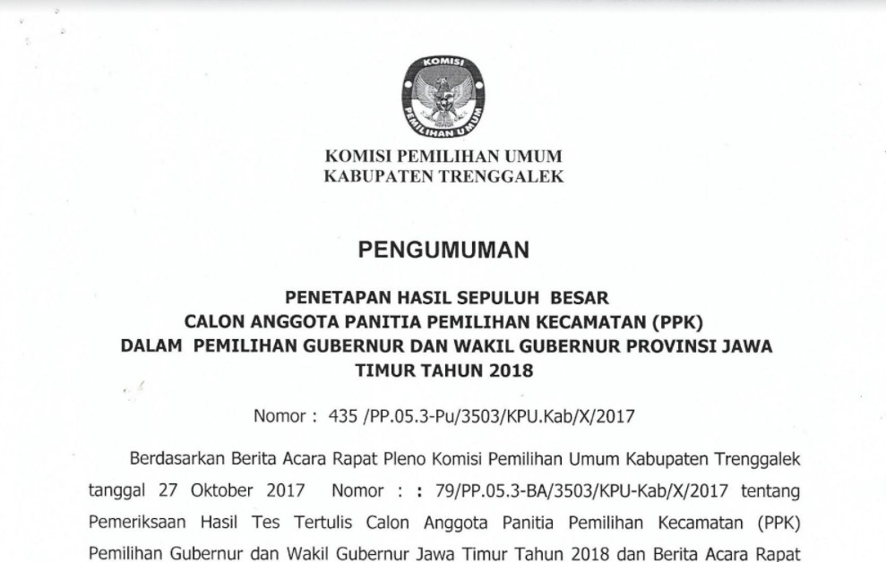 Berikut disampaikan Pengumuman Nomor : 435 /PP.05.3-Pu/3503/KPU.Kab/X/2017 Tentang Penetapan Hasil Sepuluh Besar Calon Anggota Panitia Pemilihan Kecamatan (PPK) dalam Pemilihan Gubernur dan Wakil Gubernur Provinsi Jawa Timur Tahun 2018.