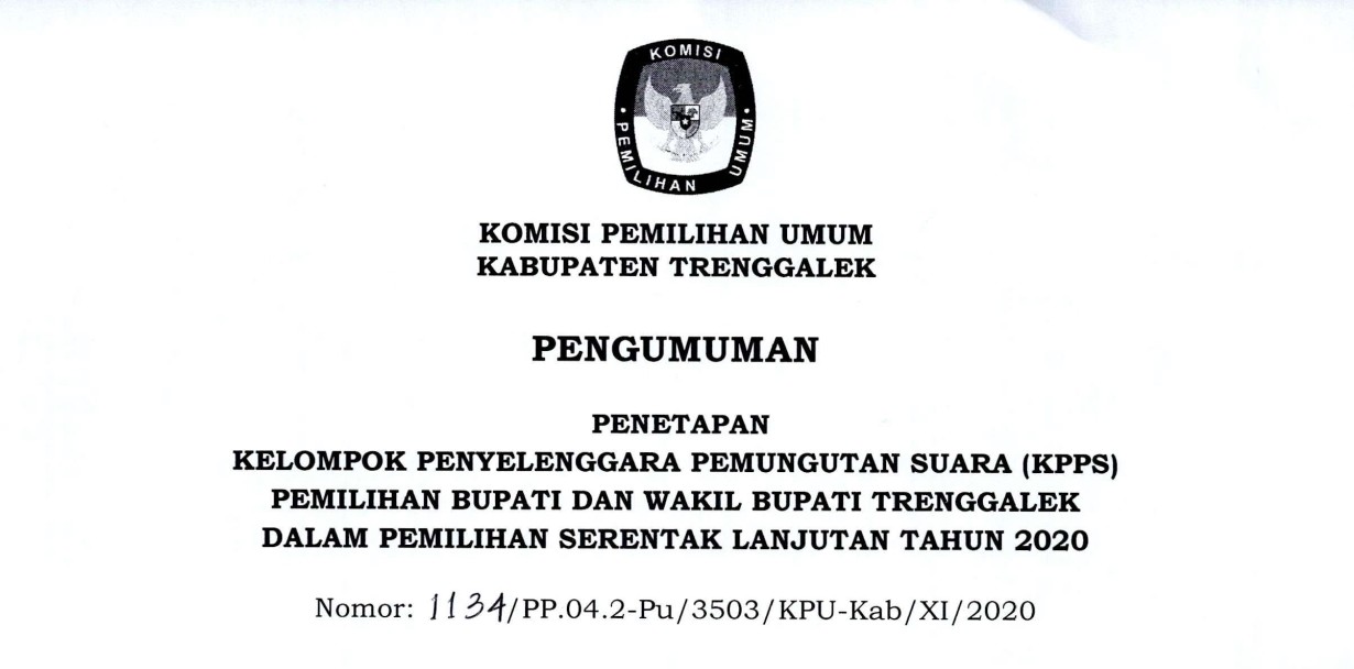 PENGUMUMAN: PENETAPAN KELOMPOK PENYELENGGARA PEMUNGUTAN SUARA (KPPS) PEMILIHAN BUPATI DAN WAKIL BUPATI TRENGGALEK DALAM PEMILIHAN SERENTAK LANJUTAN TAHUN 2020