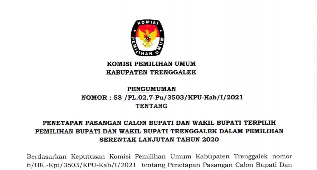 Berikut disampaikan pengumuman nomor: 58 /PL.02.7-Pu/3503/KPU-Kab/I/2021 TENTANG PENETAPAN PASANGAN CALON BUPATI DAN WAKIL BUPATI TERPILIH PEMILIHAN BUPATI DAN WAKIL BUPATI TRENGGALEK DALAM PEMILIHAN SERENTAK LANJUTAN TAHUN 2020.