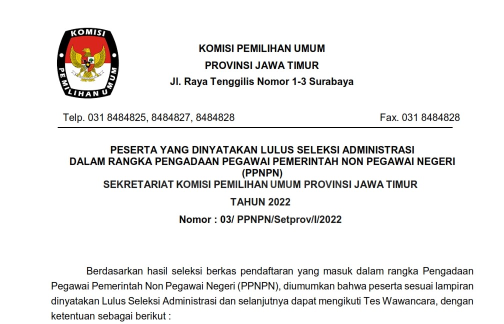 PENGUMUMAN PESERTA YANG DINYATAKAN LULUS SELEKSI ADMINISTRASI DALAM RANGKA PENGADAAN PEGAWAI PEMERINTAH NON PEGAWAI NEGERI (PPNPN) SEKRETARIAT KPU PROV JAWA TIMUR TAHUN 2022