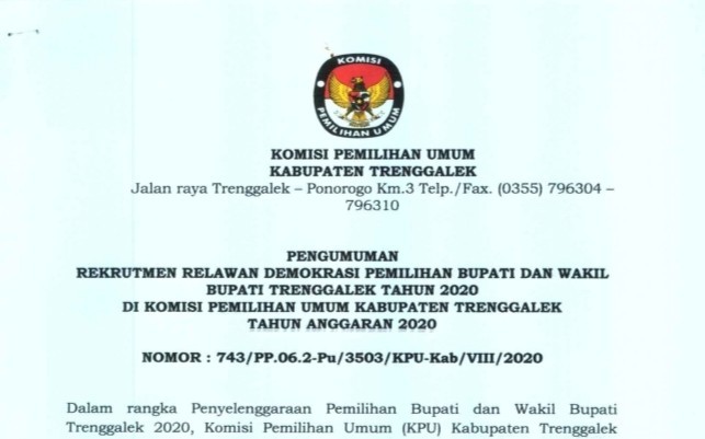 PENGUMUMAN : REKRUTMEN RELAWAN DEMOKRASI PEMILIHAN BUPATI DAN WAKIL BUPATI TRENGGALEK TAHUN 2020 DI KPU KAB. TRENGGALEK TAHUN ANGGARAN 2020