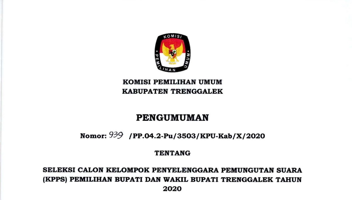 Berikut disampaikan pengumuman Nomor: 939/PP.04.2-Pu/3503/KPU-Kab/X/2020 TENTANG SELEKSI CALON KELOMPOK PENYELENGGARA PEMUNGUTAN SUARA (KPPS) PEMILIHAN BUPATI DAN WAKIL BUPATI TRENGGALEK TAHUN 2020.