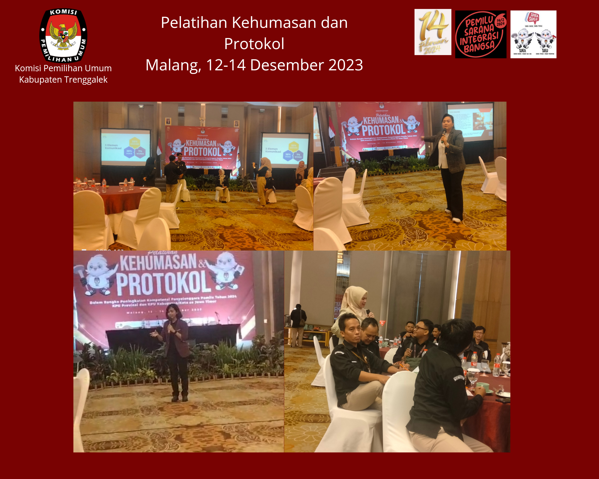 Hari ini Selasa sampai dengan Kamis, tanggal 12 sampai dengan 14 Desember 2023, tiga orang dari KPU Kabupaten Trenggalek mengikuti Pelatihan Kehumasan dan Protokol yang diselenggarakan oleh KPU Provinsi Jawa Timur. Kegiatan tersebut diselenggarakan di Hall Hotel Harris Malang yang dihadiri oleh Anggota KPU Kabupaten/Kota Divisi Sosialisasi, Pendidikan Pemilih, Partisipasi Masyarakat dan Sumber Daya Manusia serta dua orang staf yang membidangi kehumasan dan protokol. Hadir dari KPU Kabupaten Trenggalek yaitu Nurani, Anggota KPU Kabupaten Trenggalek Divisi Sosialisasi, Pendidikan Pemilih, Partisipasi Masyarakat dan Sumber Daya Manusia, serta Woro Wikan Maheswari dan Agung Tri Laksana, Staf Subbagian Teknis Penyelenggaraan Pemilu, Partisipasi dan Hubungan Masyarakat. Kegiatan dimulai pada hari Selasa, tanggal 12 Desember 2023 dan dibuka resmi oleh Gogot Cahyo Baskoro, Anggota KPU Provinsi Jawa Timur Divisi Sosialisasi, Pendidikan Pemilih, dan Partisipasi Masyarakat, pada pukul 14.30 WIB.
