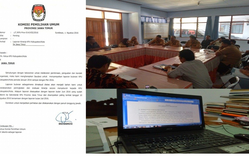 Ketika proses laporan bulanan Kinerja KPU sedang dipersiapkan untuk Bulan Juli, hadir lagi surat edaran yang meminta laporan untuk bulan Januari hingga Mei dari KPU Propinsi Jawa Timur. Inilah yang membuat tim penyusun laporan KPU Kabupaten Trenggalek sejak lusa kemarin hingga 5 Agustus mendatang super sibuk memenyelesaikan tugas tersebut.