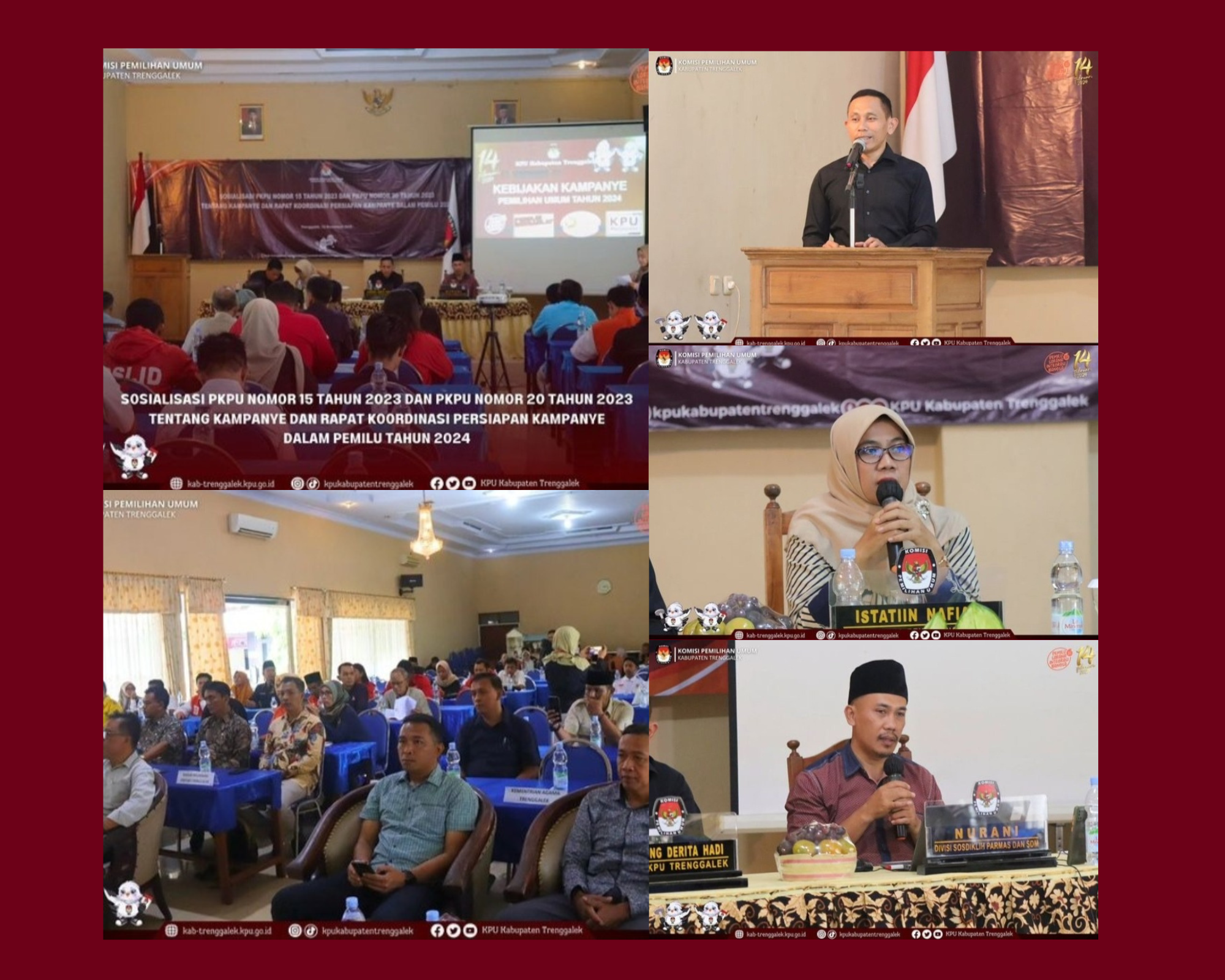 Hari ini, Minggu, tanggal 12 November 2023, dalam rangka persiapan Kampanye, Komisi Pemilihan Umum (KPU) Kabupaten Trenggalek menyelenggarakan kegiatan Sosialisasi PKPU Nomor 15 dan 20 Tahun 2023 serta Rapat Koordinasi Persiapan Kampanye dalam Pemilu Tahun 2024. Kegiatan yang diselenggarakan di Hall Hotel Hayam Wuruk tersebut dihadiri oleh Ketua, Anggota dan Sekretariat KPU Kabupaten Trenggalek, Forkopimda, Bawaslu, OPD terkait, dan perwakilan partai politik peserta Pemilu Tahun 2024 tingkat Kabupaten Trenggalek. Acara dimulai tepat pukul 14.00 WIB oleh MC, diawali dengan Menyanyikan Lagu Kebangsaan Indonesia Raya dan Jingle Pemilu Tahun 2024 dipandu dirigen Acara dilanjutkan dengan pembacaan doa yang dipimpin oleh Haji Misdiyanto, Kasubbag Teknis Penyelenggaraan Pemilu, Partisipasi dan Hubungan Masyarakat. Acara dilanjutkan Sambutan sekaligus pembukaan acara secara resmi oleh Ketua KPU Kabupaten Trenggalek, Gembong Derita Hadi.
