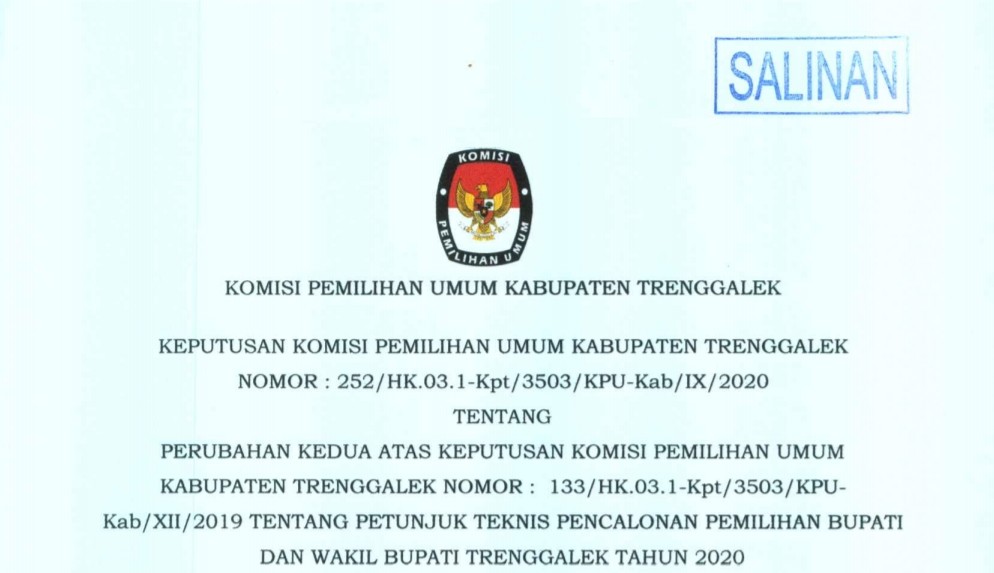 BERIKUT DISAMPAIKAN KEPUTUSAN KOMISI PEMILIHAN UMUM KABUPATEN TRENGGALEK NOMOR : 252/HK.03.1-Kpt/3503/KPU-Kab/IX/2020 TENTANG PERUBAHAN KEDUA ATAS KEPUTUSAN KOMISI PEMILIHAN UMUM KABUPATEN TRENGGALEK NOMOR : 133/HK.03.1-Kpt/3503/KPU-Kab/XII/2019 TENTANG PETUNJUK TEKNIS PENCALONAN PEMILIHAN BUPATI DAN WAKIL BUPATI TRENGGALEK TAHUN 2020.