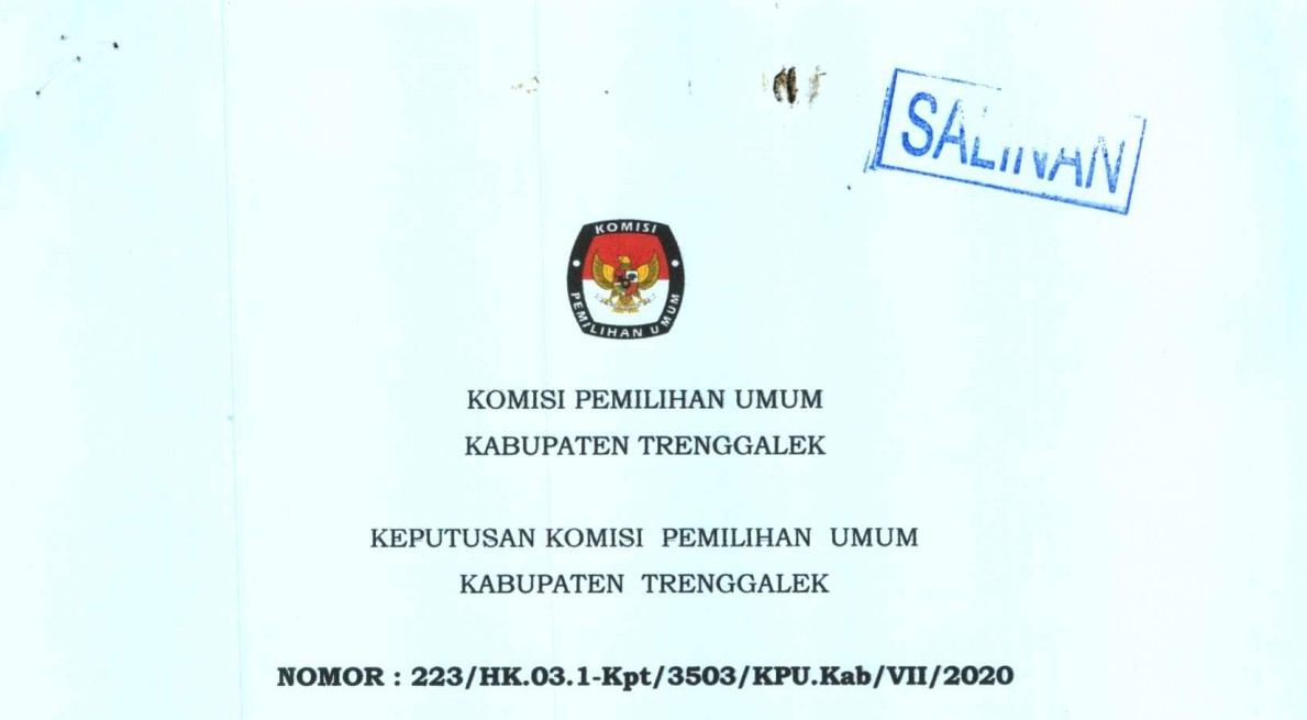 Keputusan Komisi Pemilihan Umum Kabupaten Trenggalek Nomor : 223/HK.03.1-Kpt/3503/KPU.Kab/VII/2020 dapat diunduh di sini.