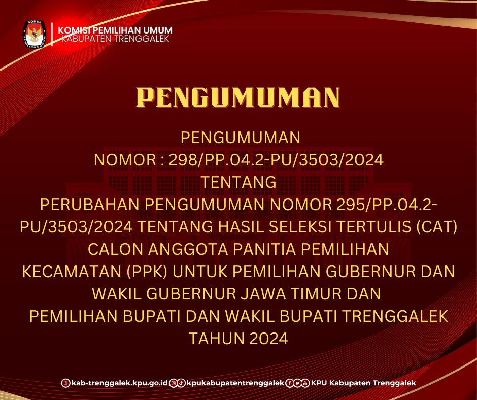 - Berdasarkan hasil pencermatan Kembali hasil seleksi tertulis (CAT) calon anggota Panitia Pemilihan Kecamatan (PPK) terdapat kekeliruan nama yang dinyatakan lulus Seleksi Tertulis (CAT) Calon Anggota Panitia Pemilihan Kecamatan (PPK) berdasarkan Pengumuman KPU Kabupaten Trenggalek nomor : 295/PP.04.2-Pu/3503/2024 tanggal 9 Mei 2024.