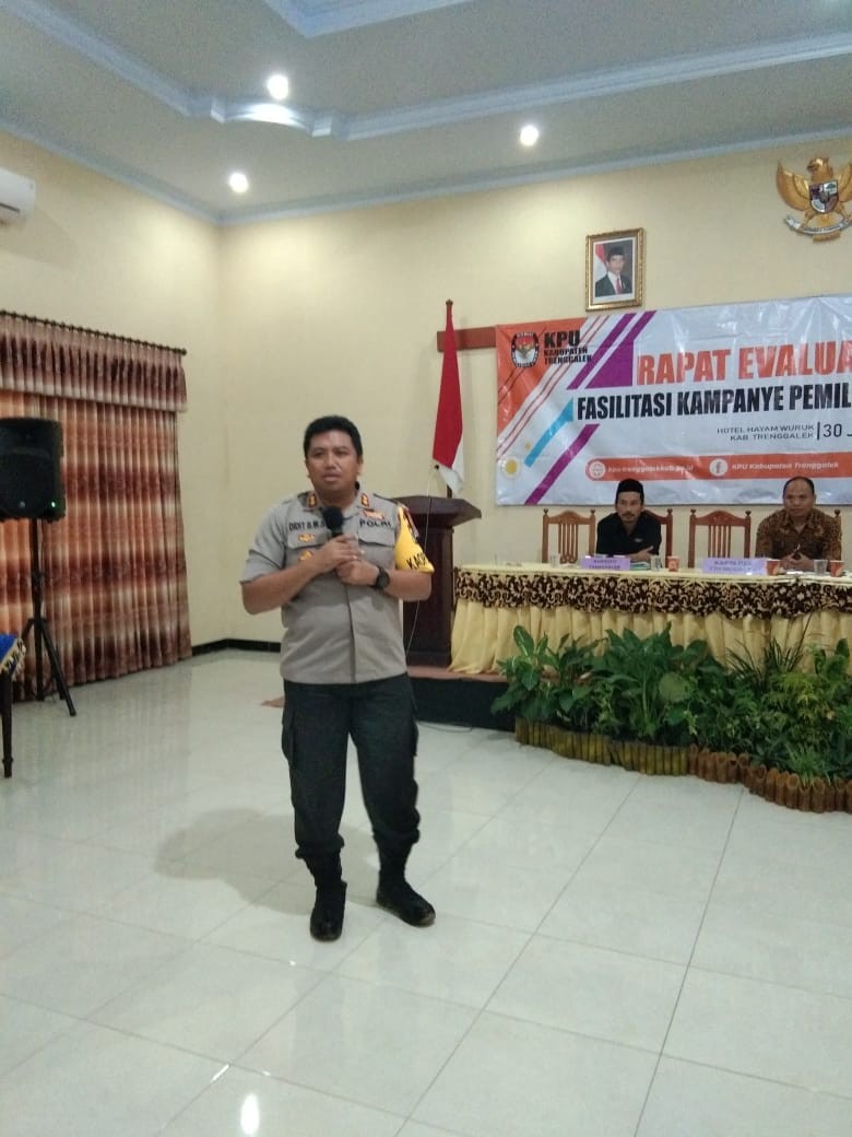 Dalam kegiatan Evaluasi Kampanye Pemilu 2019 di Hotel Hayam Wuruk Trenggalek pada hari Kamis (30/07/2019) lalu juga menghadirkan Kapolres Trenggalek sebagai pemantik diskusi. Komisi Pemilihan Umum (KPU) Kabupaten Trenggalek menghadirkan Kapolres dalam kapasitasnya untuk melakukan paparan evaluasi pengamanan kampanye Pemilu 2019 lalu.