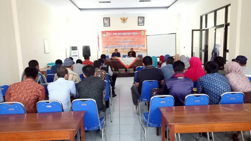 TUGU – Kemarin (Senin, 25/12/2017), PPK Kecamatan Tugu menggelar Bimbingan teknis terkait pembentukan PPDP (Panitia Pemutakhiran Data Pemilih). Acara bertempat di Aula Kecamatan Tugu. PPK Kecamatan Tugu mengundang Ketua PPS dan Sekretaris PPS se-Kecamatan Tugu. Adapun materi Bimtek kali ini disampaikan oleh Soliudin selaku Divisi Partisipasi Masyarakat dan Sumber Daya Manusia (SDM-Parmas). Seluruh undangan hadir tepat waktu dengan personil lengkap. Hal ini menunjukkan semangat panitia penyelenggara pemilu dalam rangka menyukseskan Pilgub Jatim 2018.