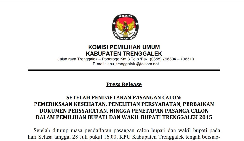 Berikut disampaikan Press Release Tahapan Pencalonan dalam Pemilihan Bupati dan Wakil Bupati Kabupaten Trenggalek Tahun 2015 oleh Ketua Pokja Pencalonan. Silahkan di unduh disini.