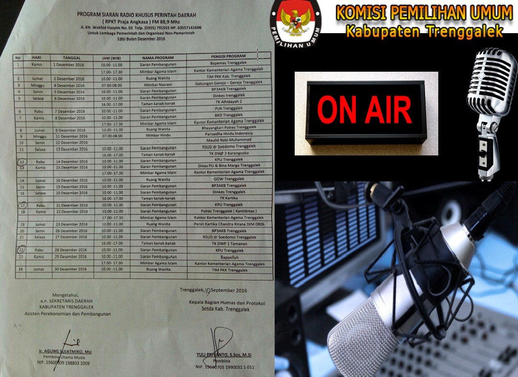 Berdasarkan jadwal siaran yang dilampirkan dalam surat tersebut, untuk Bulan Oktober, KPU Kabupaten Trenggalek mendapatkan jadwal siaran pada Hari Rabu, 26 Oktober 2016 pukul 10.00-11.00. Untuk bulan November, Hari Rabu tanggal 23 November 2016 pukul 10.00-11.00 dan Hari Rabu 30 November 2016 pukul 10.00-11.00. Sedangkan untuk bulan Desember ada tiga jadwal siaran, yaitu: Hari Rabu 14 Desember 2016 pukul 10.00-11.00, Hari Rabu 21 Desember 2016 pukul 10.00-11.00, Hari Rabu 28 Desember 2016 pukul 10.00-11.00.