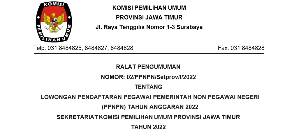 RALAT PENGUMUMAN NOMOR: 02/PPNPN/Setprov/I/2022 TENTANG LOWONGAN PENDAFTARAN PEGAWAI PEMERINTAH NON PEGAWAI NEGERI (PPNPN) TA 2022 SEKRETARIAT KPU PROV JAWA TIMUR TAHUN 2022