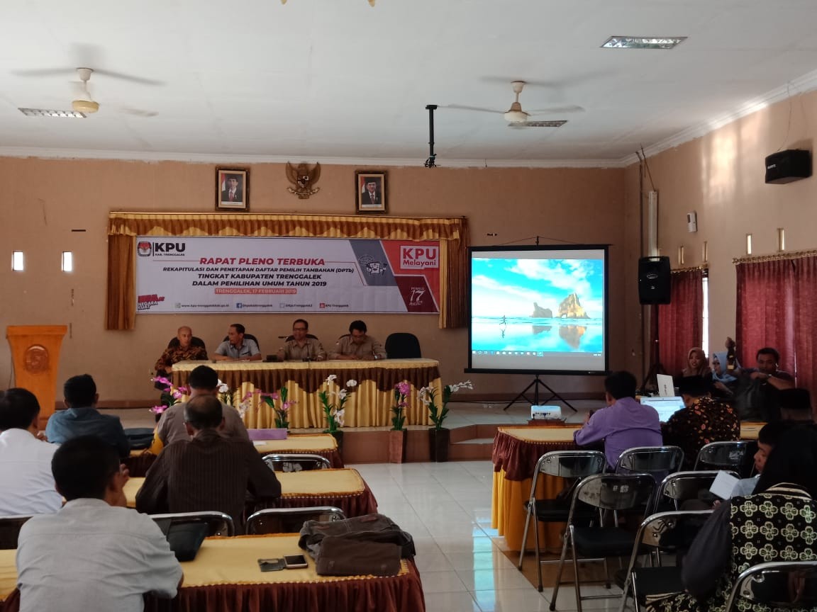 Acara Rapat Pleno dilaksanakan di Aula Balai Benih Ikan (BBI) Kabupaten Trenggalek. Rapat ini dihadiri oleh Badan Pengawas Pemilu (Bawaslu), pimpinan Partai Politik, dan Panitia Pemilihan Kecamatan (PPK) se-Kabupaten Trenggalek. Hadir dari KPU Kabupaten Trenggalek Ketua KPU dan tiga orang komisioner.