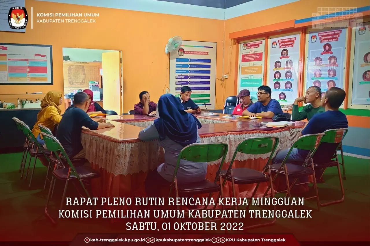 TRENGGALEK- Hari ini, Sabtu, tanggal 1 Oktober 2022, KPU Kabupaten Trenggalek menyelenggarakan Rapat Pleno yang membahas perkembangan jalannya tahapan Pemilu Tahun 2024. Rapat pleno dimulai pukul 10.00 WIB dipimpin oleh Ketua KPU Kabupaten Trenggalek, Gembong Derita Hadi, dan dihadiri seluruh Anggota KPU Kabupaten Trenggalek, Sekretaris dan Kasubbag KPU Kabupaten Trenggalek. Dalam sambutan pembukaan rapat pleno internal, Gembong Derita Hadi, Ketua Kabupaten Trenggalek, menyampaikan bahwa kesibukan masing-masing Divisi menyebabkan antar anggota KPU Kabupaten Trenggalek tidak saling bersua dan bertatap muka. Untuk itu, Gembong berharap agar dalam rapat ini seluruh anggota KPU Kabupaten Trenggalek, Sekretaris dan Kasubbag mengemukakan pendapat dan pengalaman atau apapun yang didapat dari rapat koordinasi serta juga potensi kendala yang dirasa dapat berpengaruh pada jalannya tahapan Pemilu tahun 2024 di Kabupaten Trenggalek. Hal tersebut agar Pemilu berjalan dengan baik, lancar, dan aman. “Saya harap dalam Rakor ini semua Divisi, Sekretaris, dan Kasubbag mengemukakan pendapatnya dan pengalaman yang didapat dalam Rakor serta potensi kendala, perkembangan jalannya tahapan Pemilu tahun 2024. Ini untuk dicarikan solusi yang strategis agar Pemilu berjalan baik dan lancar”, kata Gembong.