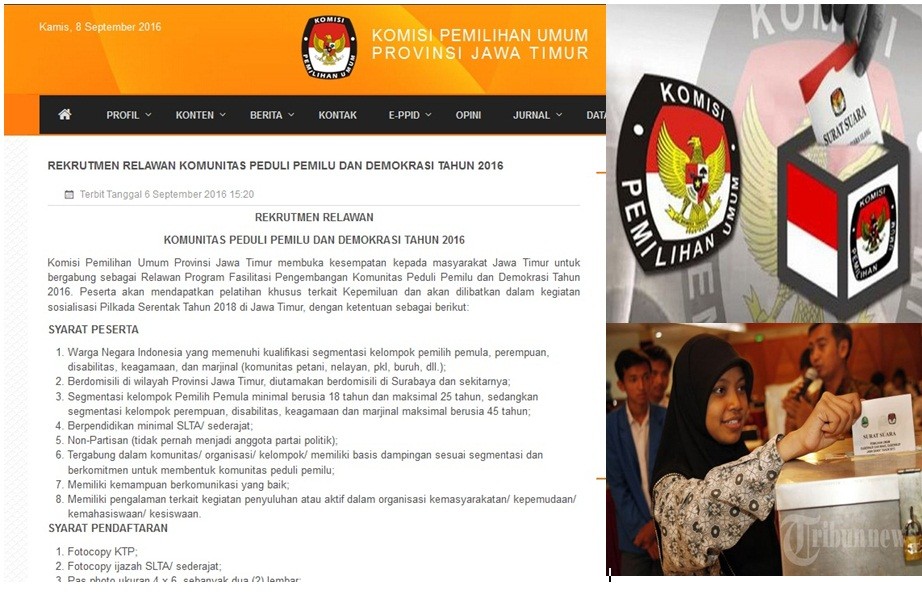 Salah satunya adalah yang dilakukan KPU Propinsi Jawa Timur dengan membentuk Relawan Program Fasilitasi Pengembangan Komunitas Peduli Pemilu dan Demokrasi Tahun 2016. Rekrutmen ini dibuka mulai tanggal 6 September sampai dengan 18 September 2016.