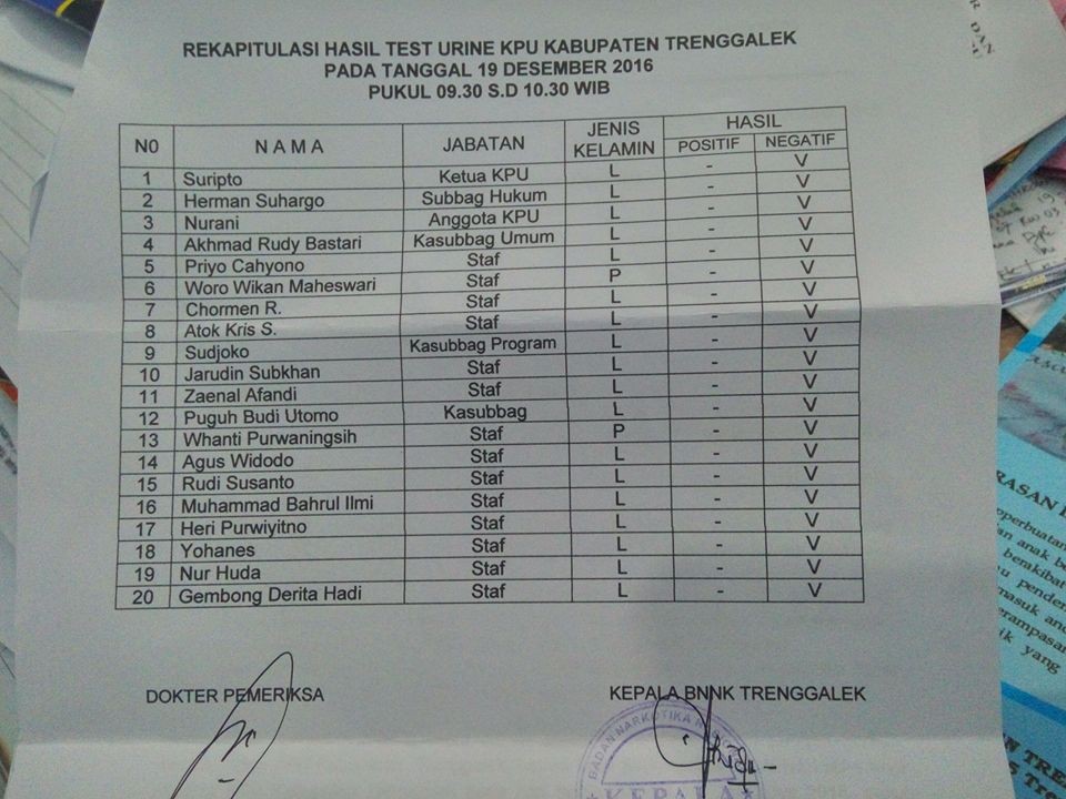 Dan ternyata hasil dari tes tersebut sudah dikirim oleh BNN Kabupaten Trenggalek akhir tahun lalu. Dalam rapat Analisa Evaluasi Harian sore ini (Rabu, 04/01/2017) baru diumumkan secara resmi oleh Ketua KPU Kabupaten Trenggalek, Suripto, yang memimpin jalannya Rapat. Dari 20 orang yang dites urinnya, menurut Suripto yang membacakan surat rekapitulasi hasil tes urin tertanggal 19 Desember 2016 menyatakan bahwa semuanya negatif alias bebas dari narkoba.