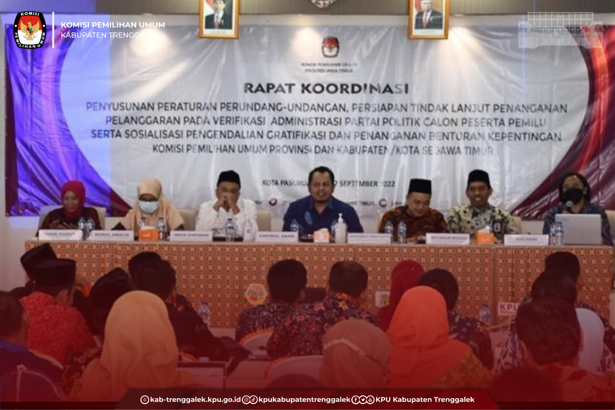 TRENGGALEK— Rapat Koordinasi (Rakor) Penyusunan Peraturan Perundang-Undangan, Persiapan Tindak Lanjut Penanganan Pelanggaran pada Verifikasi Administrasi Partai Politik Calon Peserta Pemilu serta Sosialisasi Pengendalian Gratifikasi dan Penanganan Benturan Kepentingan KPU Provinsi dan KPU Kabupaten/Kota se Jawa Timur digelar pada 16 September 2022. Acara ini bertempat di Aula Kantor KPU Kota Pasuruan. KPU Kabupaten Trenggalek melalui Divisi Hukum dan Pengawasan bersama Kasubab Hukum dan Sumber Daya Manusia hadir dalam kegiatan ini.