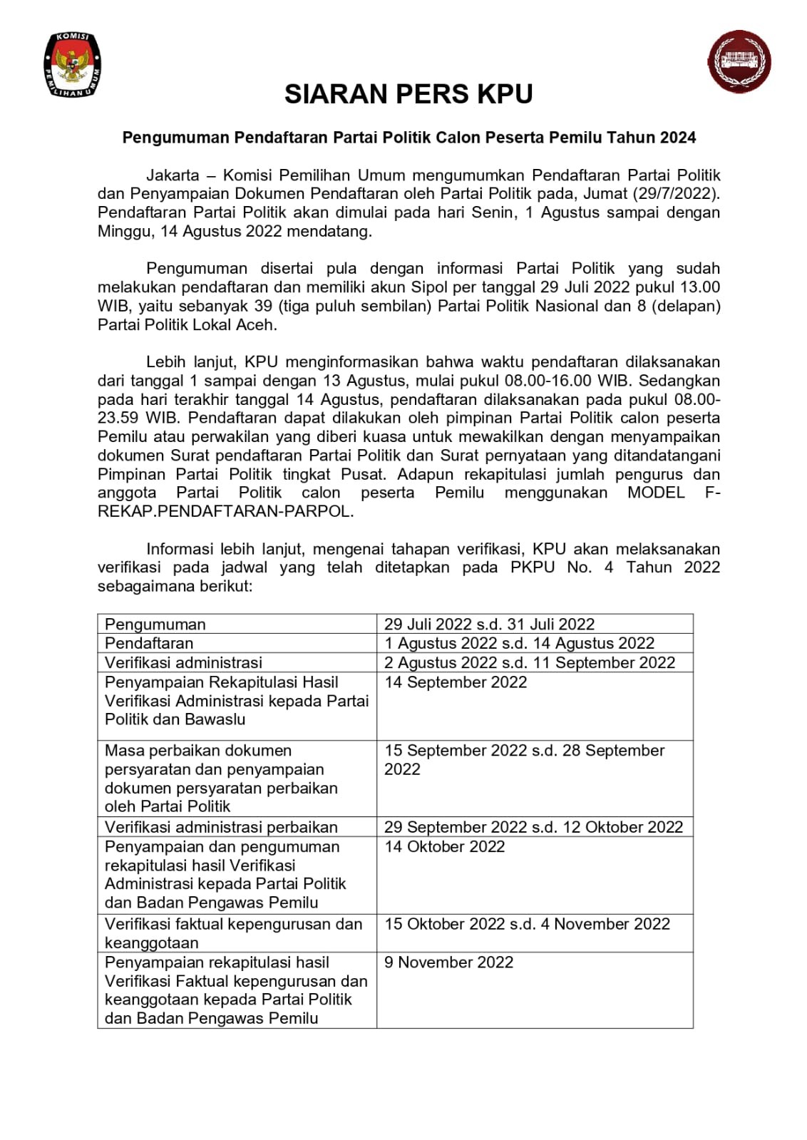 Jakarta – Komisi Pemilihan Umum mengumumkan Pendaftaran Partai Politik dan Penyampaian Dokumen Pendaftaran oleh Partai Politik pada, Jumat (29/7/2022). Pendaftaran Partai Politik akan dimulai pada hari Senin, 1 Agustus sampai dengan Minggu, 14 Agustus 2022 mendatang. Rilis selengkapnya dapat diunduh disini