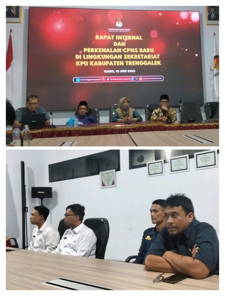 Hari ini, Kamis, tanggal 12 Juni 2025, Komisi Pemilihan Umum Kabupaten Trenggalek menyelenggarakan rapat koordinasi internal dalam rangka menyambut kehadiran 2 (dua) orang pegawai Calon Pegawai Negeri Sipil (CPNS). CPNS tersebut merupakan hasil penerimaan CPNS KPU Tahun Anggaran 2024. CPNS tersebut yaitu Deniko dan Abdul Bashit Umami. Kedua CPNS tersebut mulai bekerja di KPU Kabupaten Trenggalek sejak hari Selasa, tanggal 10 Juni 2025 setelah menjalani Orientasi Tugas di KPU Provinsi Jawa Timur.
