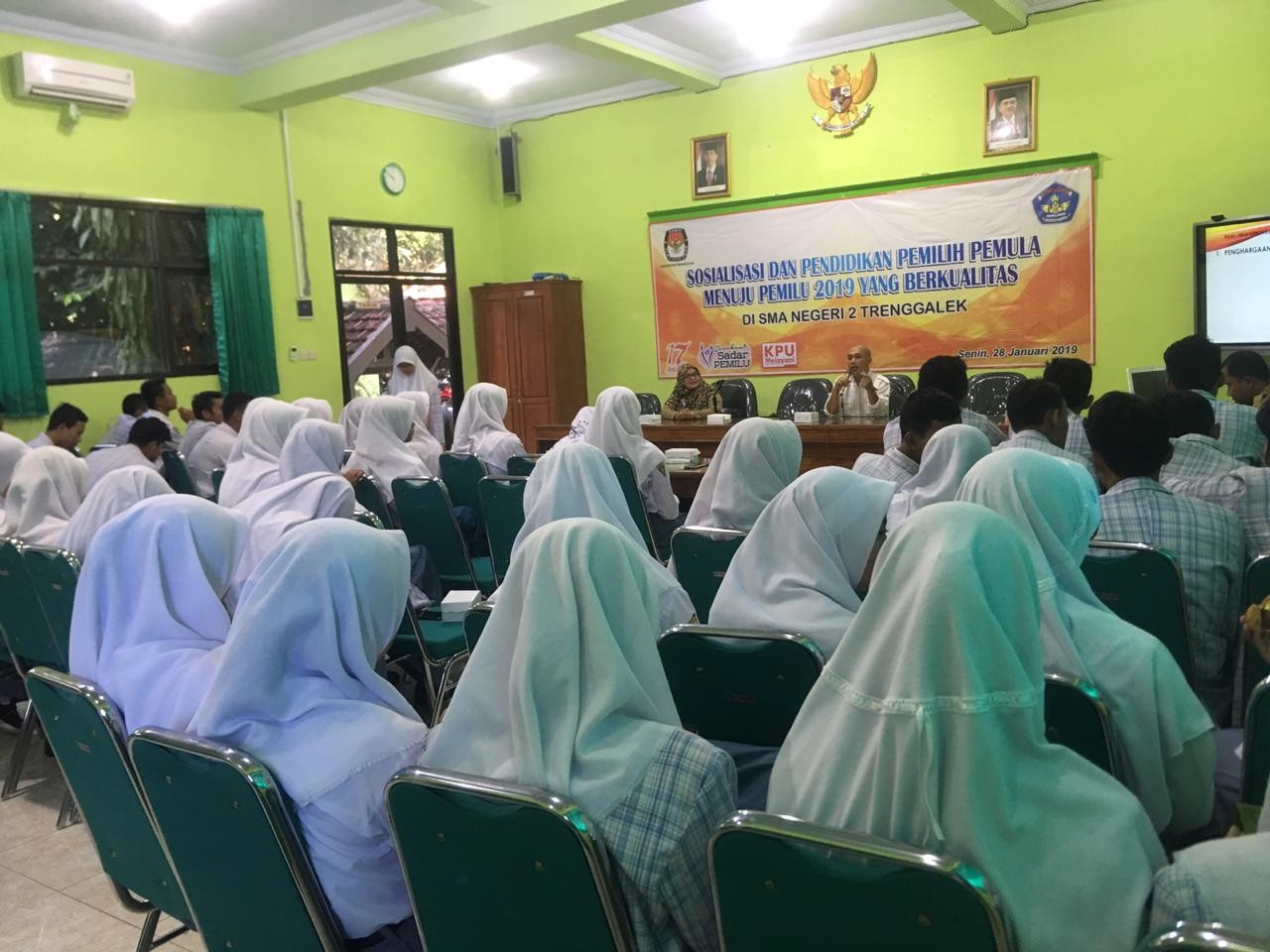 TRENGGALEK, 28/01/2019— Sosialisasi dan pendidikan pemilih (Sosdiklih) terus digencarkan, bahkan bisa dibilang KPU Kabupaten Trenggalek tiap hari ada kegiatan sosialisasi. Salah satu sasaran yang kali ini dipilih adalah Pemilih Pemula, yaitu para aktivis organisasi intra sekolah di SMAN 2 Trenggalek.